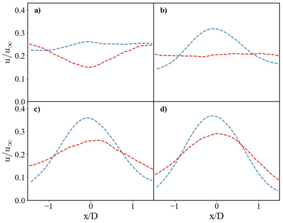 Mean Horizontal velocity profiles at different heights above the surface. The non-dimensional is compared between the SS (red dashed line) and the SHS (blue dashed line). Profiles are shown at vertical distances of (a) y/D = 0.25, (b) y/D = 0.5, (c) y/D = 0.75, and (d) y/D = 1.0.