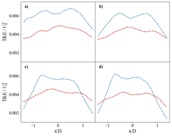 Horizontal profiles of turbulent kinetic energy (TKE). Comparison of non-dimensional TKE for the SS (red dashed line) and SHS (blue dashed line). Profiles are shown at vertical distances of (a) y/D = 0.25, (b) y/D = 0.5, (c) y/D = 0.75, and (d) y/D = 1.0.