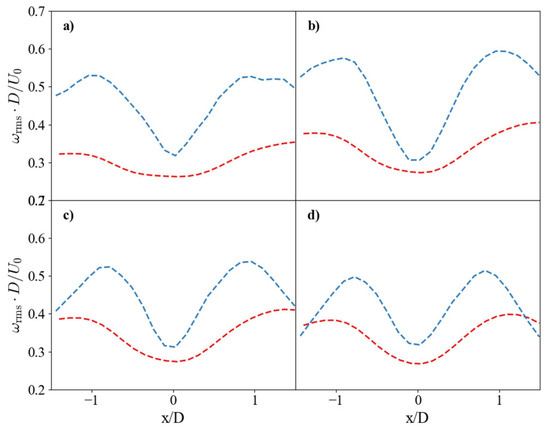 Horizontal profiles of root-mean-square (RMS) vorticity. Comparison of non-dimensional RMS vorticity for the SS (red dashed line) and SHS (blue dashed line). Profiles are shown at vertical distances of (a) y/D = 0.25, (b) y/D = 0.5, (c) y/D = 0.75, and (d) y/D = 1.0.