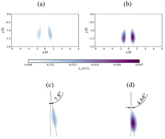 Comparison of non-dimensional averaged swirl strength contours: (a) SS and (b) SHS. The corresponding angular deviation of the dominant vortex cores is shown in (c) and (d), respectively.