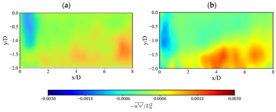 The mean RSS profiles in Figure 10 confirm this interpretation. Approaching the surface at y/D = 0.75 and y/D = 0.5 (Figure 10c,b), the RSS amplitude drops more significantly for the SHS case, indicating reduced momentum transport near the wall. This reduction is attributable to the lower wall shear enabled by the superhydrophobic coating. Conversely, the stronger RSS peaks observed for the SS case signify more intense turbulent momentum transport driven by higher surface friction.