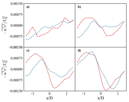 Horizontal profiles of Reynolds shear stress (RSS). Comparison of non-dimensional RSS for the SS (red dashed line) and SHS (blue dashed line). Profiles are shown at vertical distances of (a) y/D = 0.25, (b) y/D = 0.5, (c) y/D = 0.75, and (d) y/D = 1.0.