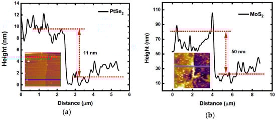 Height profiles of (a) PtSe2 and (b) MoS2. Insets: related 2D AFM images.