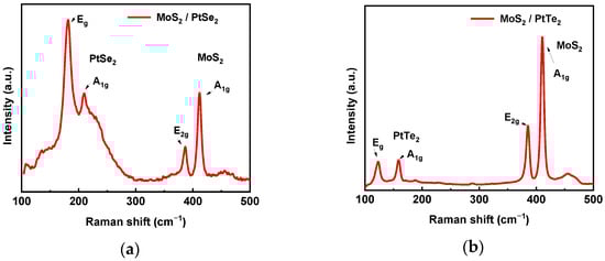 Raman spectroscopy was carried out on both MoS2/PtSe2 and MoS2/PtTe2 heterostructures to confirm the successful formation and quality after the fabrication. The Raman spectrum of the MoS2/PtSe2 heterostructure in Figure 4a shows vibrational peaks from both PtSe2 and MoS2. The spectra of PtSe2 films exhibit two characteristic peaks at approximately 177 cm−1 and 206 cm−1, which represent the Eg and A1g modes of layered PtSe2, respectively []. The Eg peak originates from the in-plane vibration of selenium (Se) atoms, and the A1g peak is caused by the out-of-plane vibration of Se atoms. A red-shift in the position of both peaks and an increase in the intensity ratio of the two peaks are observed as the number of PtSe2 layers increases []. This behavior can be explained by an increasing out-of-plane contribution due to an increase in van der Waals interactions between the layers []. The full width at half-maximum (FWHM) of the Eg peak indicates the material quality of PtSe2 []. For high-quality TAC-grown PtSe2 films, the FWHM is smaller than 5 cm−1 []. The 387 cm−1 (E2g) and 412 cm−1 (A1g) peaks are from MoS2, with a spacing of 25 cm−1, characteristic of few-layer thickness [].