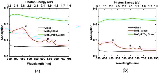 Absorbance spectra of (a) MoS2 and MoS2/PtSe2 heterostructure, and (b) MoS2 and MoS2/PtTe2 heterostructure.