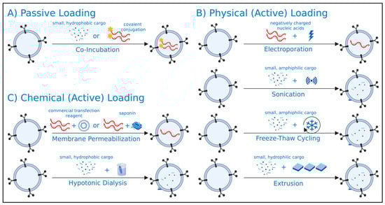 General overview of post-isolation (exogenous) extracellular vesicle (EV) loading strategies. EVs isolated from producer cells may undergo (A) passive, (B) active physical, or (C) active chemical loading strategies for the encapsulation of therapeutic cargo into the EV lumen. Created in BioRender. Mediratta, K. (2025) https://BioRender.com/6jpo955 (accessed on 5 September 2025).