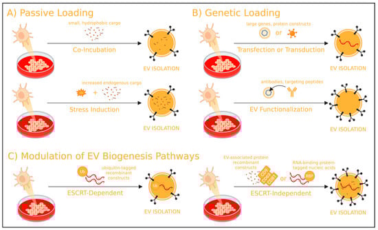 General overview of pre-isolation (endogenous) EV loading strategies. EV producer cells may undergo (A) passive, (B) genetic, or (C) modulation of EV biogenesis loading strategies for the encapsulation of therapeutic cargo into subsequently isolated EVs. Created in BioRender. Mediratta, K. (2025) https://BioRender.com/h4372c5 (accessed on 5 September 2025).