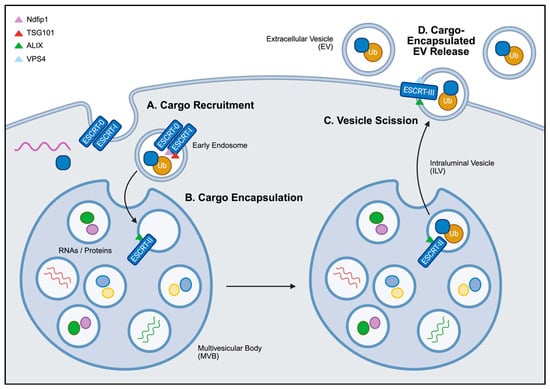 General overview of ESCRT-dependent EV cargo loading. (A) Ubiquinated proteins are recognized by ESCRT-0 and ESCRT-I and recruited to the membrane of early endosomes, facilitated by Ndfip1 and TSG101. (B) These endosomes subsequently mature into intraluminal vesicles (ILVs) within multivesicular bodies (MVBs). (C) With the help of ALIX and the ATPase VPS4, ESCRT-III drives the final assembly and membrane scission of ILVs from the MVBs. (D) The fusion of MVBs with the cell membrane drives the release of cargo-encapsulated ILVs, referred to as EVs in the extracellular space. Created in BioRender. Mediratta, K. (2025) https://BioRender.com/bibp7z3 (accessed on 5 September 2025).