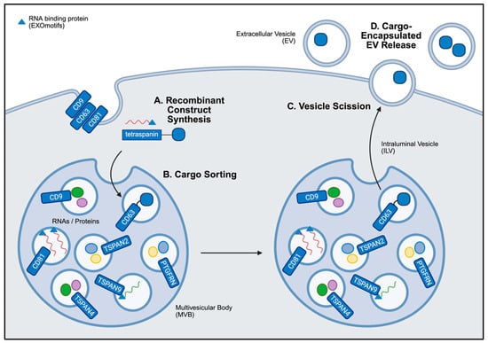 General overview of ESCRT-independent EV cargo loading. (A) The synthesis of recombinant proteins by endogenous cell machinery enables cargo to be generated by EV producer cells. (B) These recombinant constructs encoding tetraspanins, RNA-binding proteins, or lipid raft-associated motifs are sorted into intraluminal vesicles (ILVs) within multivesicular bodies (MVBs) during EV biogenesis. Cargo may be attached to the tetraspanins in the lumen or external to the ILV, depending on the construct design. (C) These variables may influence the rate of vesicle scission. (D) The fusion of MVBs with the cell membrane drives the release of cargo-encapsulated ILVs, referred to as EVs in the extracellular space. Created in BioRender. Mediratta, K. (2025) https://BioRender.com/31nzfne (accessed on 5 September 2025).