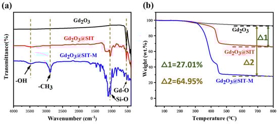 3@SIT-M exhibited any discernible weight loss below 200 °C, indicating the absence of residual aqueous solvents and confirming their negligible volatility. As the temperature increased beyond 250 °C, decomposition of the organic molecular layers began, with Gd