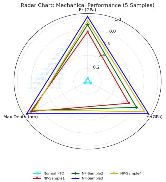Five representative devices were evaluated under identical loading conditions: one based on flat FTO and four utilizing NP-FTO (denoted NP-Sample1 to NP-Sample4). The results, summarized in Table 2 and illustrated in Figure 4, reveal consistent and significant enhancements in nanomechanical performance conferred by the NP-FTO modification: