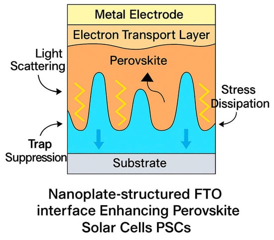 In this work, we address this gap by systematically investigating the dual effect of NP-FTO on both photovoltaic performance and mechanical robustness. By combining current–voltage characterization with nanoindentation analysis, we demonstrate that NP-FTO simultaneously enhances light harvesting, suppresses non-radiative recombination, and strengthens buried interfaces against stress-induced degradation. The results establish nanoplate-engineered FTO as a scalable, low-temperature, and solution-compatible approach that unifies high efficiency with mechanical durability, thereby advancing PSCs toward integration in flexible and roll-to-roll production platforms [22,26,27].
