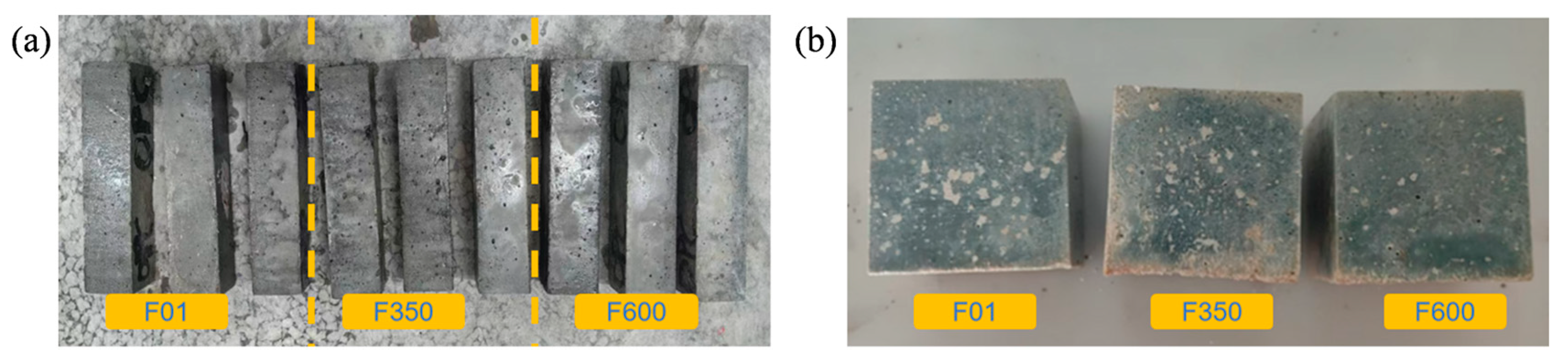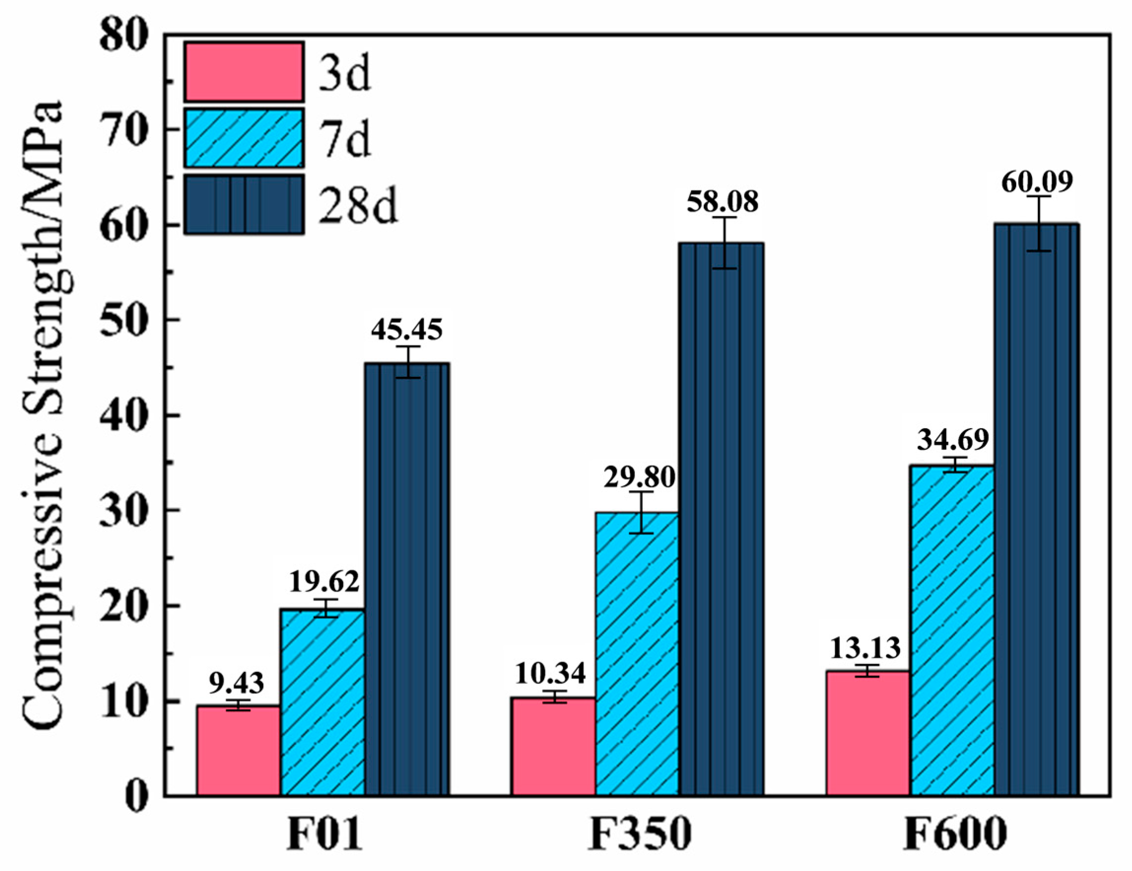 . Simultaneously, according to the principle of dissolution–crystallization, gypsum is produced. Secondary gypsum serves as an intermediate product to weaken its compressive strength. On the other hand, F600, incorporating II-U anhydrite, features a stable structure, small crystal particles, and a large specific surface area. These fine particles act as “nano-seeds”, providing numerous nucleation sites for hydration products [