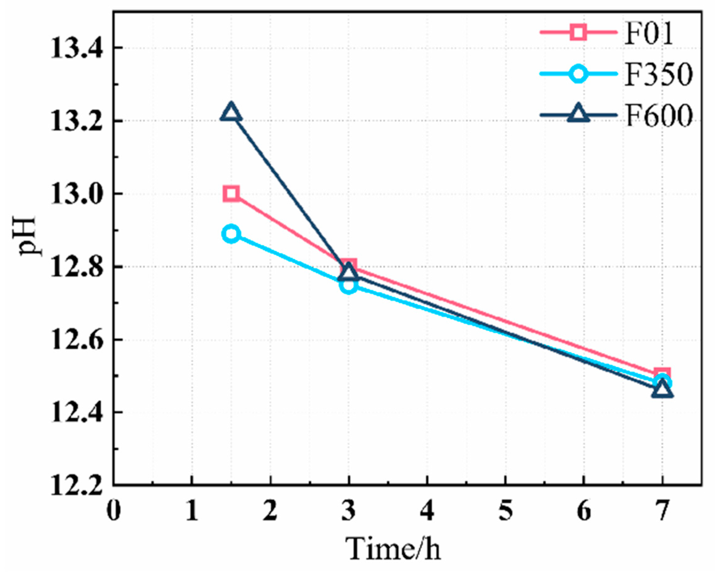 For calcium ions, the addition of II-U anhydrite increases the concentration of Ca ions. Between 1.5 h and 3 h, it is observed that F600 consumes a large amount of Ca ions when it reaches the first exothermal peak. During the deceleration period, ion precipitation is hindered, and the consumption rate maintains a balance with the production rate. A similar trend is observed for F350. Compared with F01, although fewer Ca ions are decomposed in the induction period, more Ca ions are consumed in the hydration process, leading to the generation of more hydration products and higher compressive strength.