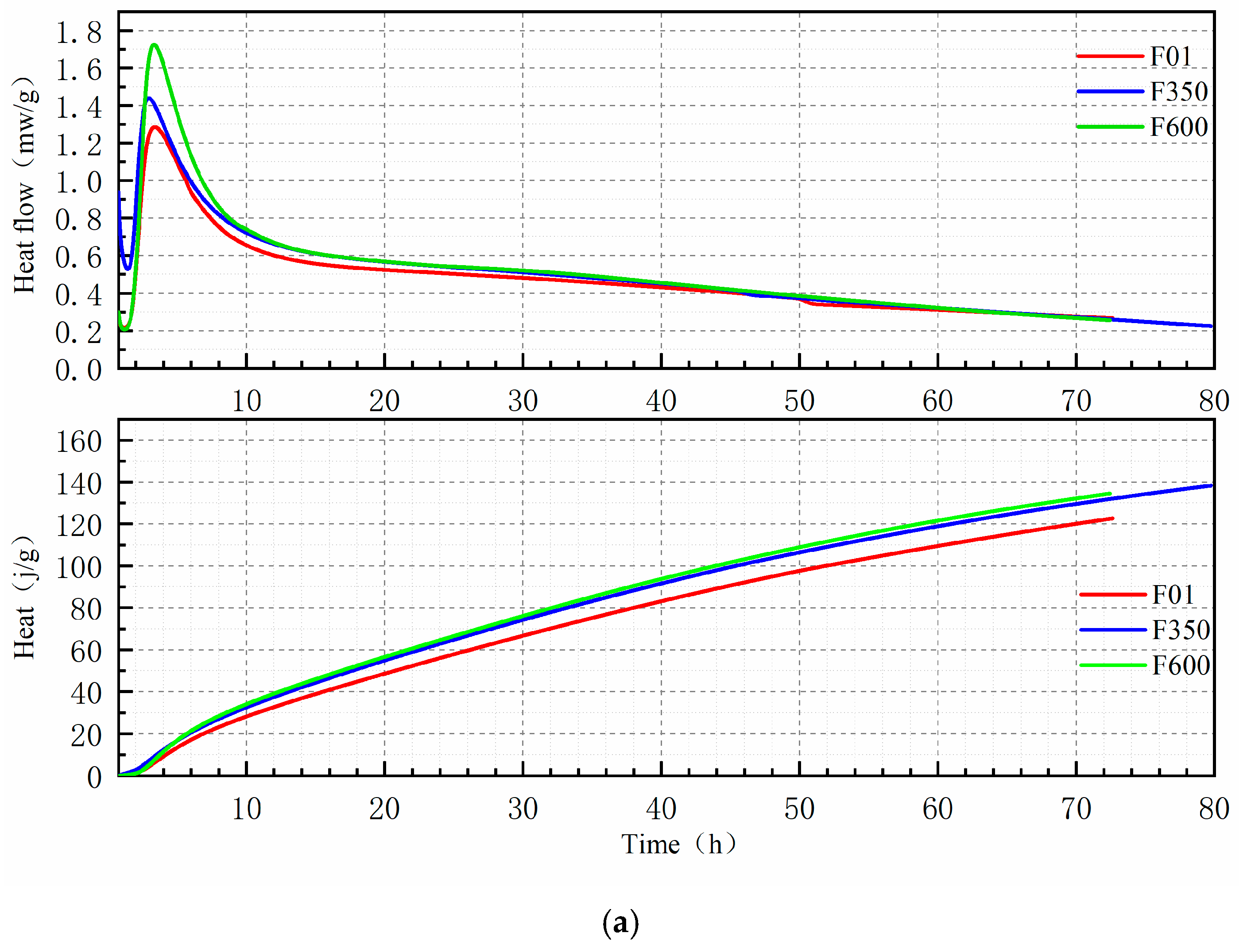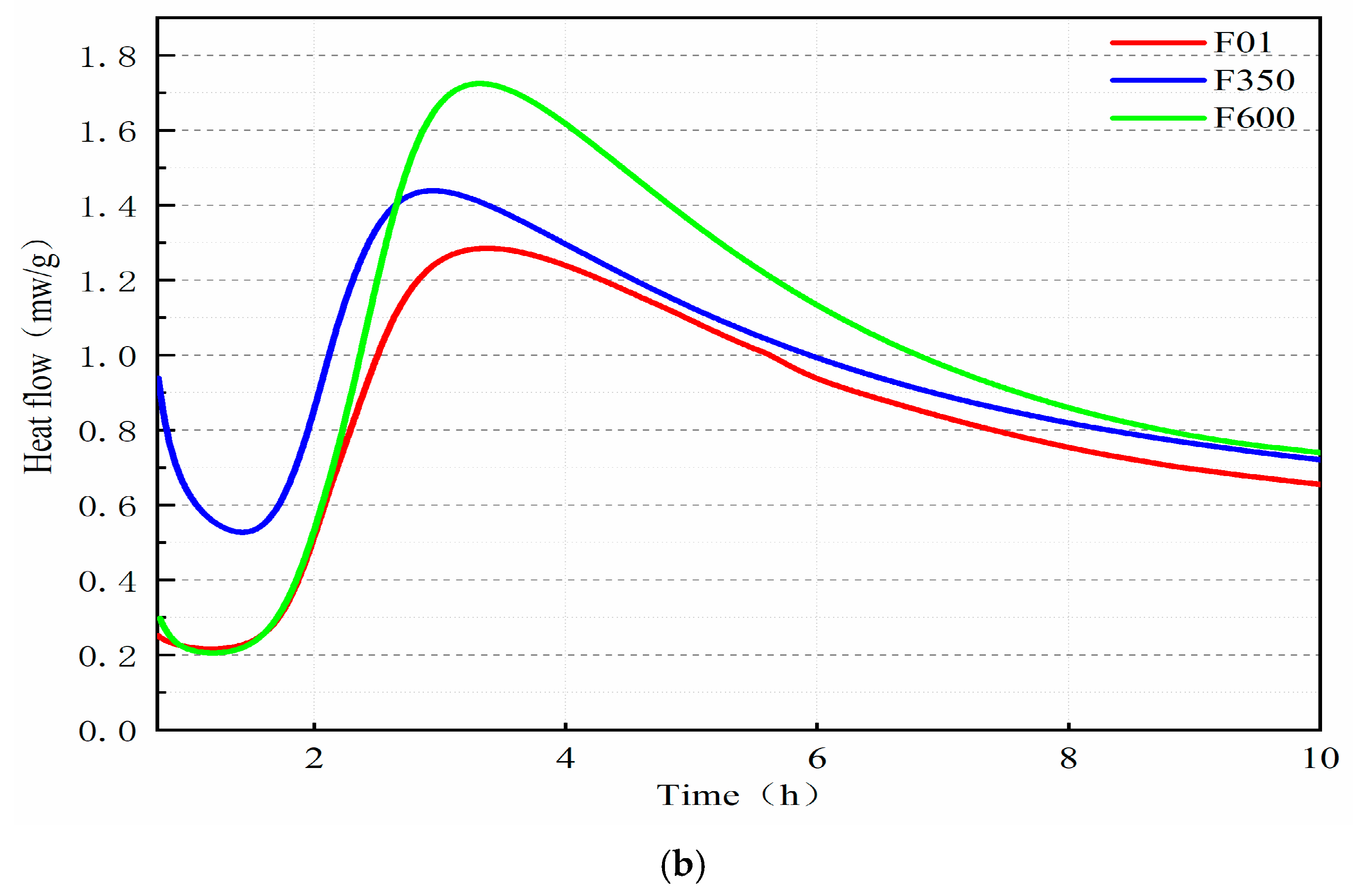 Figure 5b, it is evident that the first exothermic peak of F350—incorporating III-anhydrite—occurs at 3 h, which is earlier than that observed in F01 and F600. This suggests that F01 and F600 exhibit lower early-age solubility, slower slag dissolution rates, and limited ionic release, all of which contribute to sluggish hydration kinetics and reduced early heat evolution. In contrast, III-anhydrite in F350 acts as an efficient sulfate activator due to its high solubility, providing a rapid and abundant supply of Ca