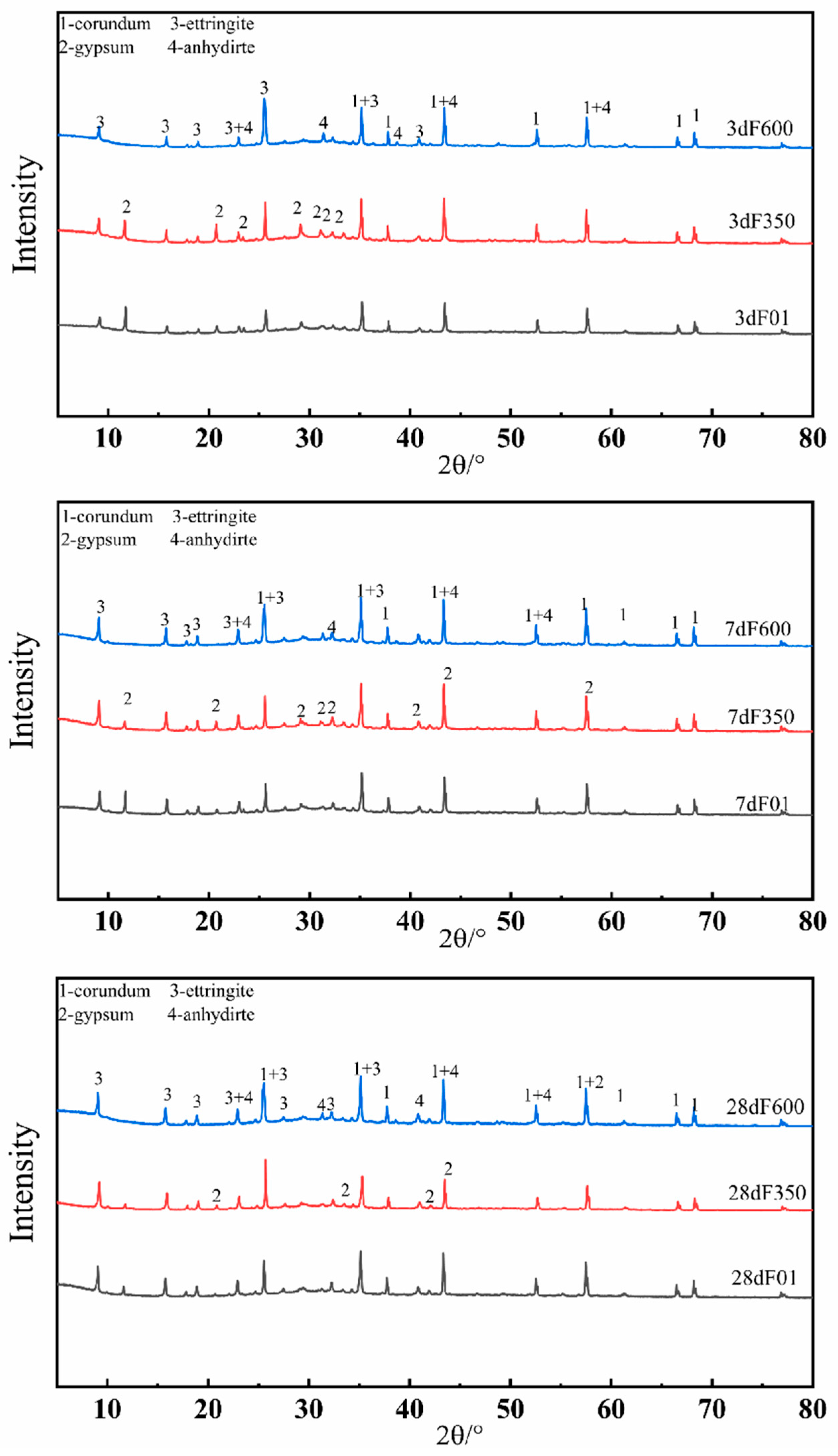 Table 3 indicate that the unreacted gypsum content of F350 is the highest at 3 days. As confirmed by the quantitative analysis, F600 produced the highest amounts of both AFt (13.48%) and C-S-H (15.04%) at 3 days, which highlights its superior nucleation effect compared with F01 and F350. This is further supported by the slower consumption of II-U anhydrite (from 7.10% at 3 days to 2.40% at 28 days, a reduction of 66.7%), compared with gypsum in F01 (77.4%) and F350 (80.5%). By contrast, F350 shows a different hydration pathway. At 28 days, it contains the highest amount of AFt (26.07%) but the lowest amount of C-S-H (13.14%). Although its compressive strength still reaches 58.8 MPa, this indicates that F350 tends to rely more on massive AFt formation rather than gel production, differing fundamentally from the C-S-H–dominated mechanism of F600. However, as the hydration age increases, the consumption rate of gypsum accelerates, leading to a decrease in characteristic peak intensity and an increase in the production of ettringite with age. This trend suggests an enhanced degree of hydration reaction in F350. Notably, In the early stages of F350, III anhydrite undergoes a hydration reaction, releasing