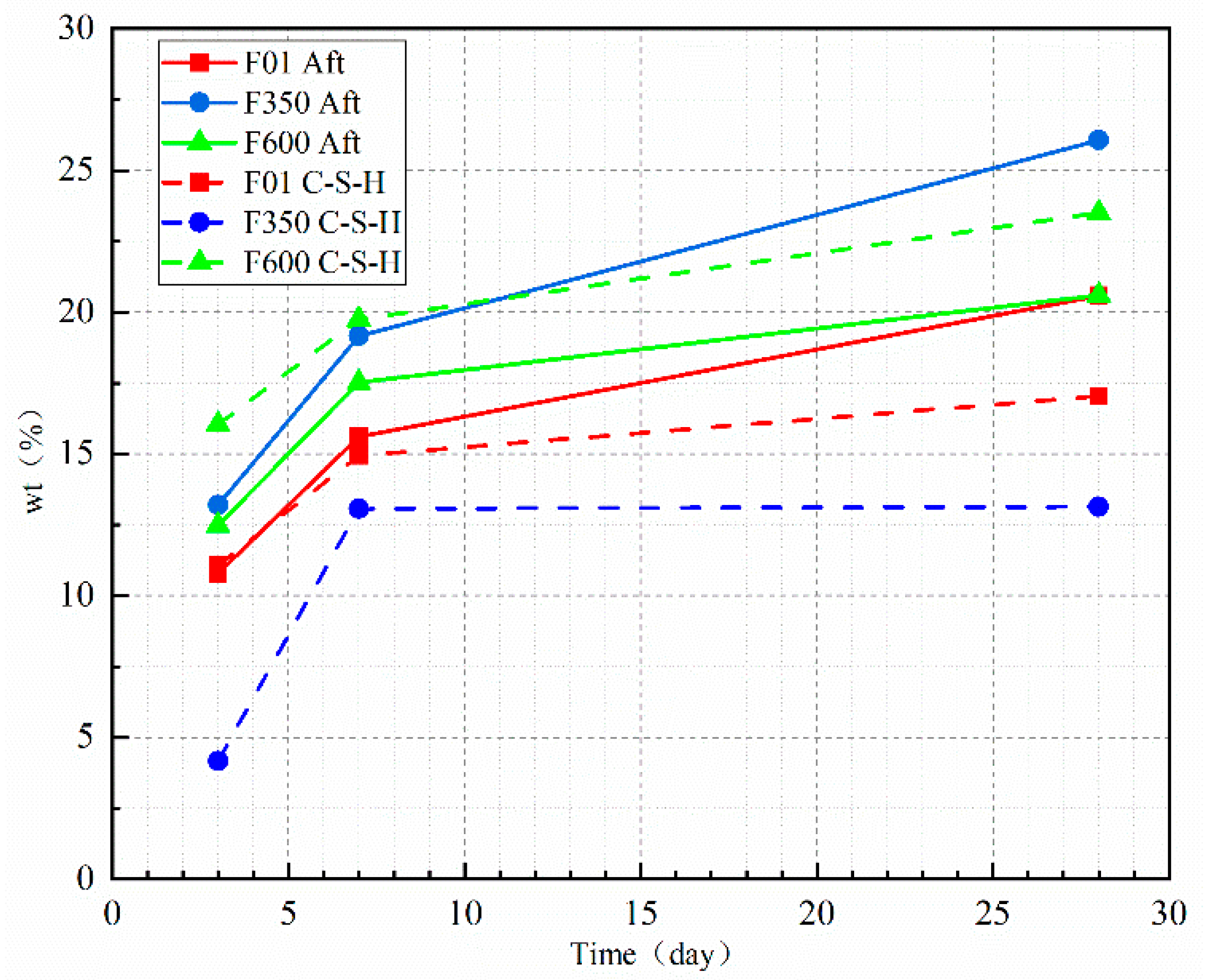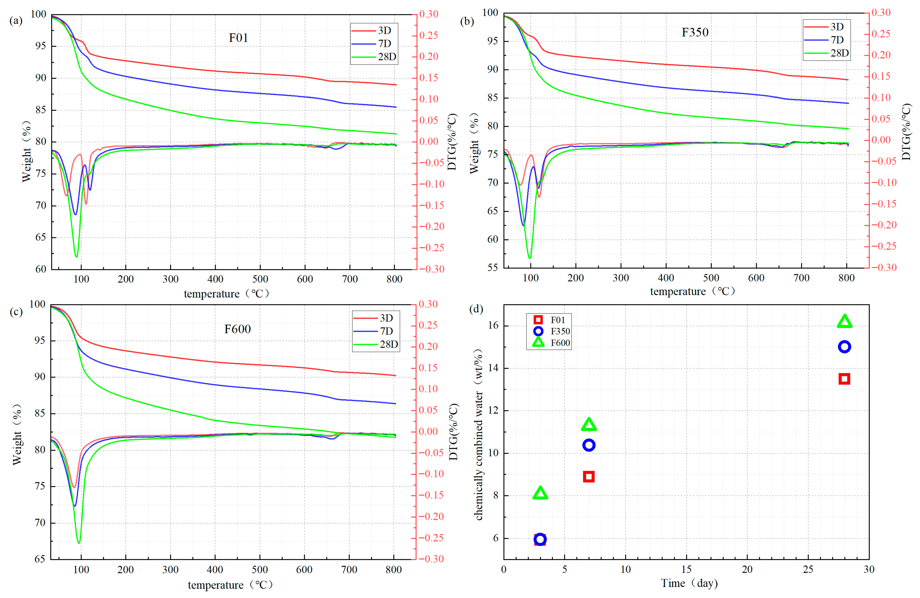 In the TG-DTG curve, the content of chemically bound water can be calculated based on the DTG result, reflecting the total amount of the two hydration products. The main water loss peaks of hydration products are concentrated in the range of 50 °C to 200 °C. In