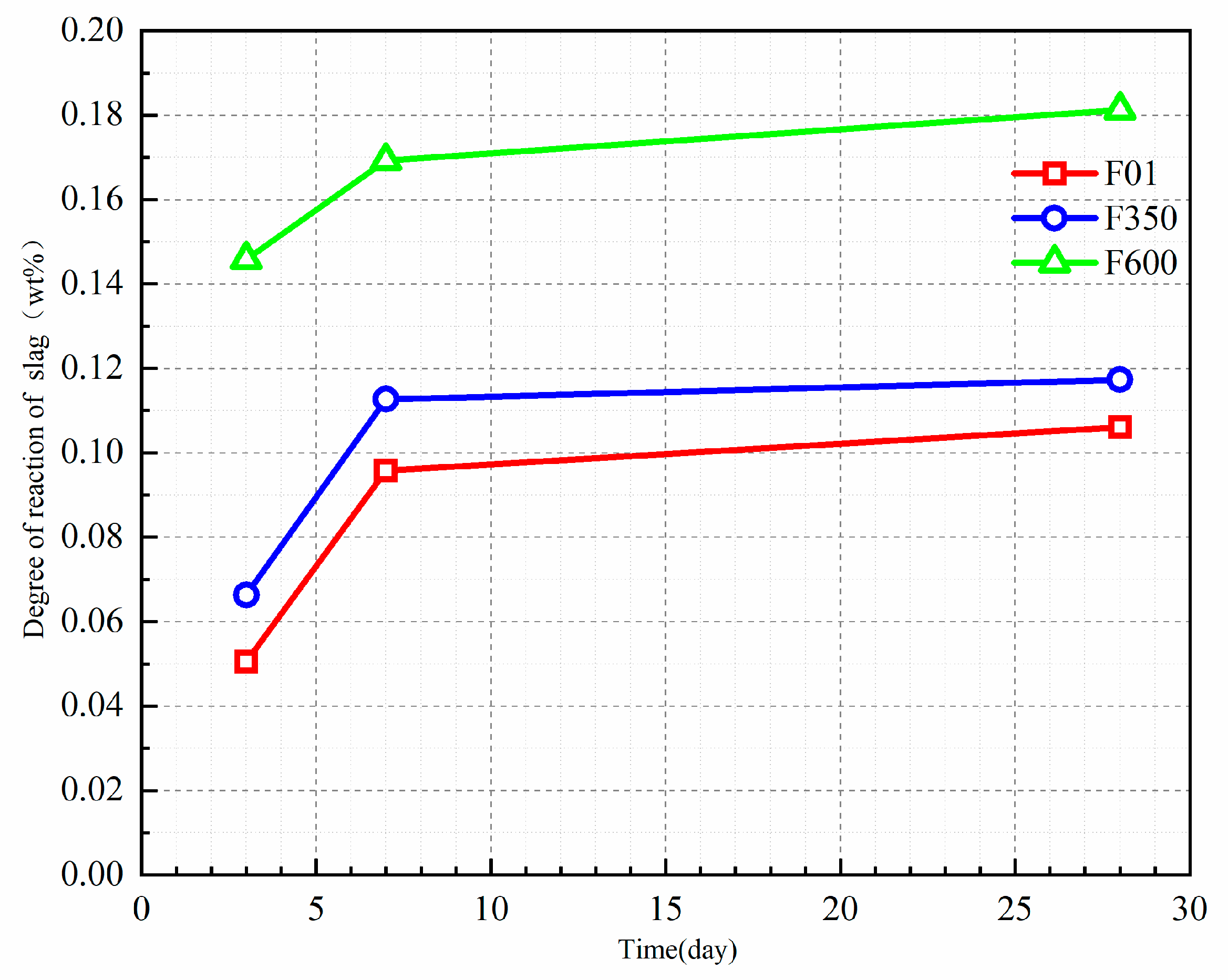 A comparison between F600 and F01 reveals that although their induction periods are similar, F600 exhibits a higher exothermic peak during the acceleration phase. This indicates that hydration reactions between the mineral powder and II-U anhydrite are more complete in F600. While the solubility of II-U anhydrite is comparable to that of F01, its larger specific surface area and more uniform dispersion in the slag matrix improve its reactivity. During dissolution, Ca2+ and SO42− ions from II-U anhydrite interact readily with the silica tetrahedra in the slag. Over time, this enhances the hydration process, promoting greater formation of ettringite and C-S-H gel. Consequently, the heat evolution increases, and the total cumulative heat release after 3 days exceeds that of both F350 and F01. This observation is consistent with the XRD analysis results.