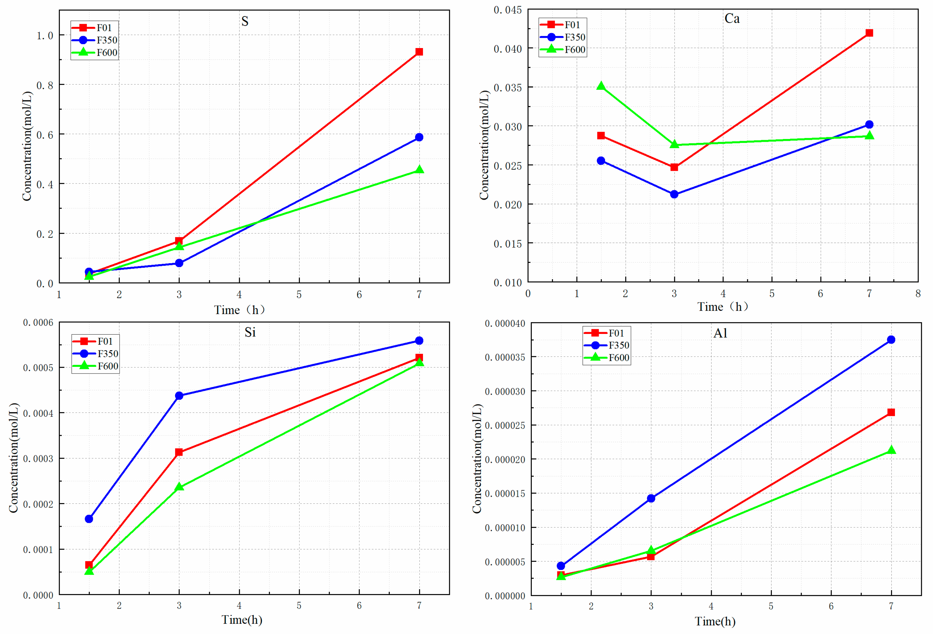 The liquid phase collected 7 h before the reaction was subjected to pH testing, and ion concentrations were measured at various time points to analyze the influence of different types of gypsum on the ion concentration of the pore solution. The concentrations of calcium, silicon, sulfur, and aluminum ions in samples from each group were analyzed, as shown in