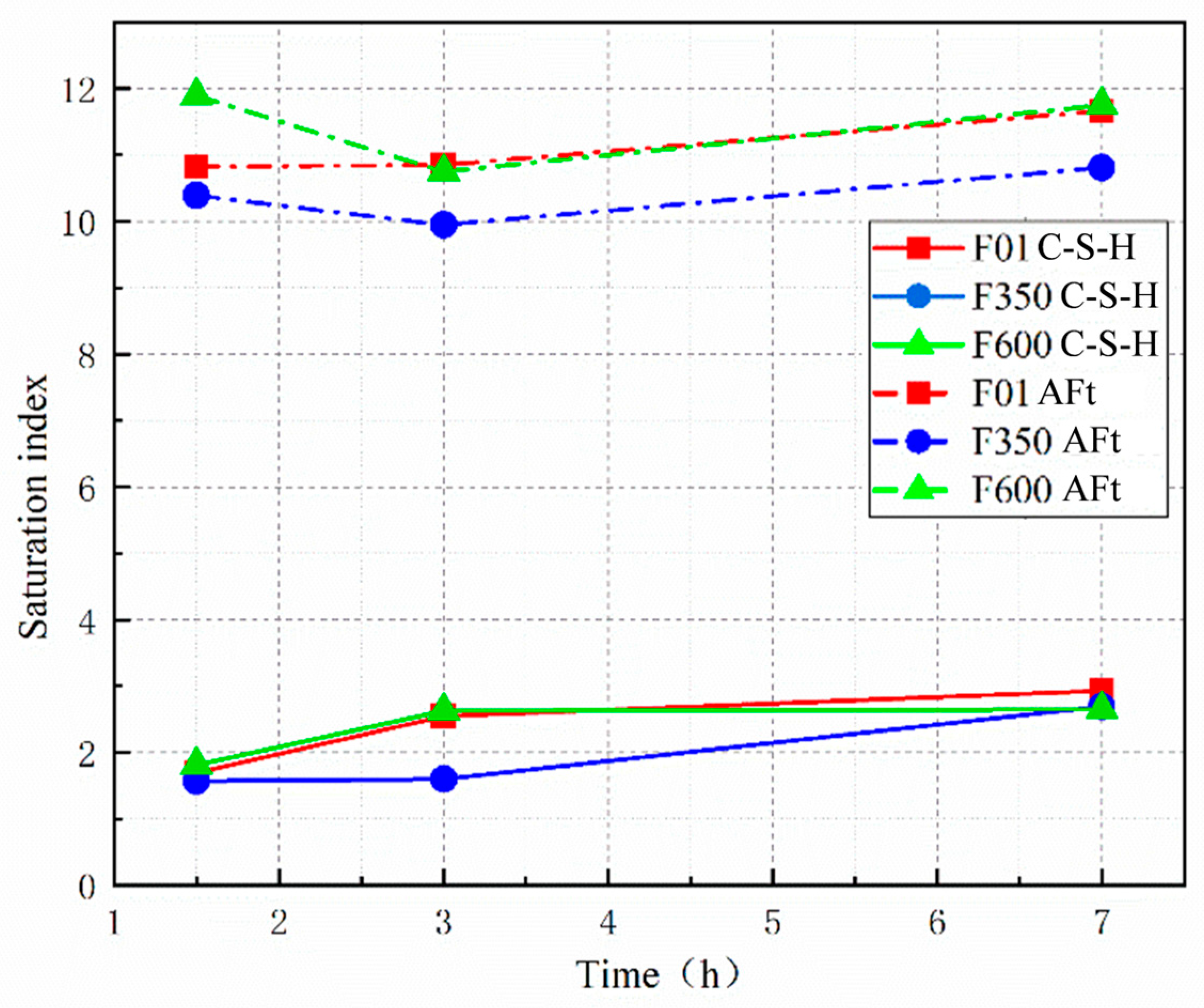 Figure 11 that compared to F01, the AFt saturation index in SSC systems with different crystal types of hard gypsum initially decreases and then increases. This indicates that the driving force for the early precipitation of ettringite first decreases and then increases, gradually increasing during the hydration decay period. Additionally, the saturation index of C-S-H gel in the calcium salt system generally shows an upward trend, indicating an increased driving force for C-S-H gel precipitation during the hydration process, making gel formation easier. The saturation index of AFt and C-S-H gel in II-U anhydrite is higher than that of the other two groups. The simulation results align with the trends observed in the heat of hydration and thermogravimetric analysis. This suggests that adjusting the concentration ratio of the pore solution with II-U anhydrite can improve the precipitation efficiency of hydration products and significantly enhance the compressive strength of the system. The slow dissolution characteristic of II-U anhydrite (
