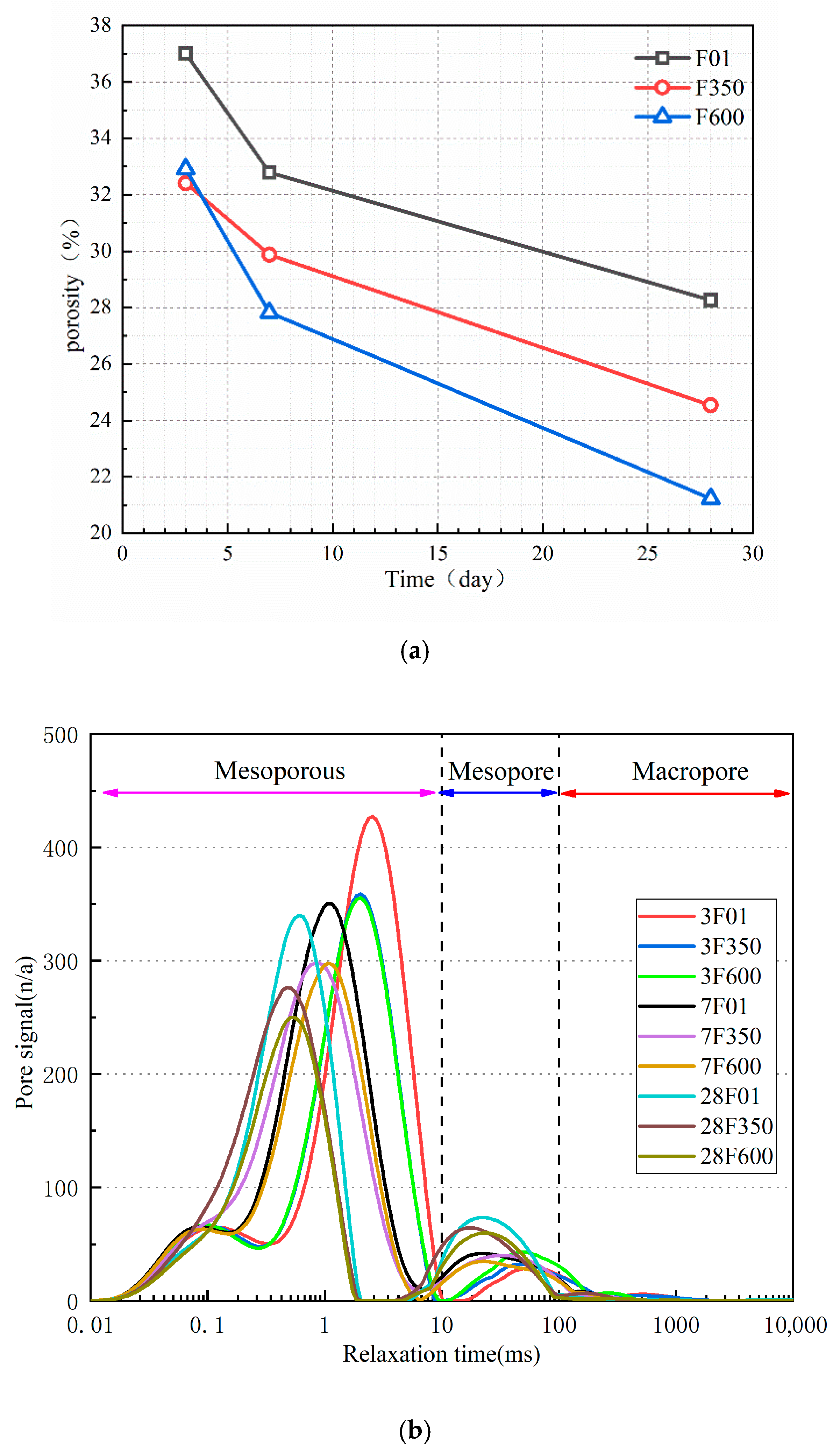 Figure 12b, the relaxation time of the main peak of F01 is 6.05 ms at 3 days, while the relaxation time of the main peak of F350 and F600 is similar, less than 5 ms. The transverse relaxation time of the main peak reflects the state of hydrogen protons in most components of the cement-based material, corresponding to the internal structure of the material and thus indicating the compressive strength of the sample. There is a negative correlation between the transverse relaxation time corresponding to the main peak and the compressive strength. Specifically, the smaller the transverse relaxation time, the greater the compressive strength. The transverse relaxation time of water in the pore is linearly related to the pore size—in other words, the shorter the relaxation time, the smaller the pore size. With increasing age, the signal strength of F600 and F350 decreases, and the transverse relaxation time decreases compared with the control group. This suggests that part of the free water in the anhydrite cement reacts with the cement, gradually transforming into CH, thus creating an alkaline environment. This stimulates the formation of combined water between gypsum and mineral powder, generating hydration products to fill the pores. Consequently, the main peak of the