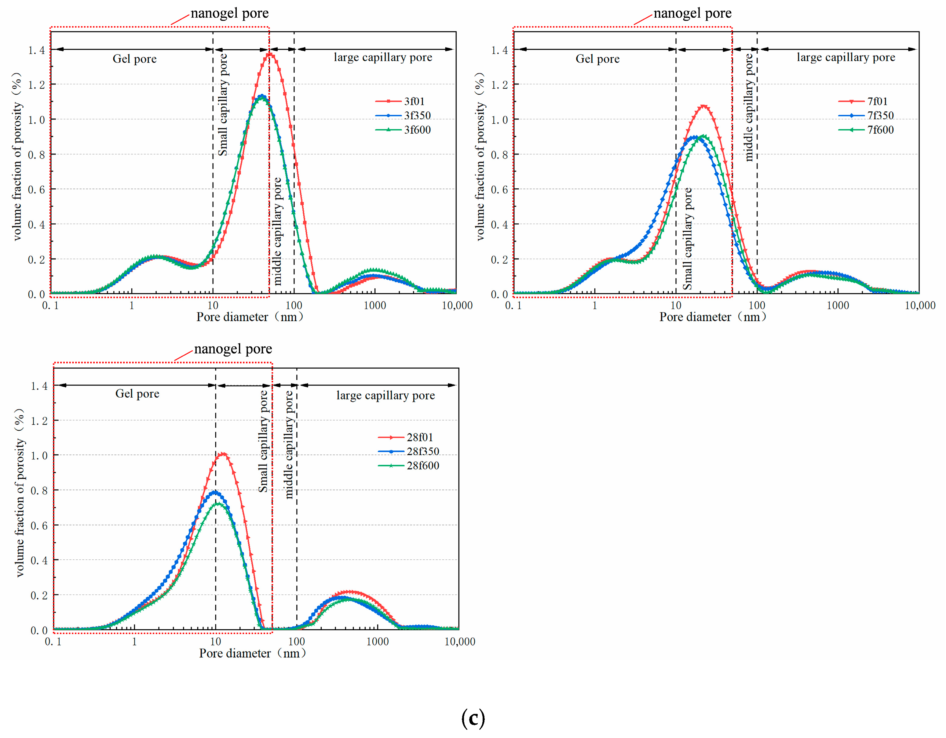 2 spectrum shifts from the capillary pore range to the gel pore range. This indicates a transformation in the pore structure: large capillary pores diminish in proportion, while gel pores become more prevalent. At 3 days, the dominant peak in all groups resides in the capillary pore range. The peak maximum for F01 is centered around 50 nm, while those for F350 and F600 are shifted toward the smaller capillary range. Over time, the pore size distribution curves of all groups shift leftward by approximately 20–50 nm. The peak area corresponding to larger pores decreases significantly, with F600 showing the smallest peak area and F01 the largest. This suggests that the incorporation of anhydrous gypsum as a sulfate activator improves the pore structure of SSC at the nanoscale. The hydration products generated fill capillary and intermediate pores, leading to a refined pore structure and a substantial reduction in porosity by 28 days [