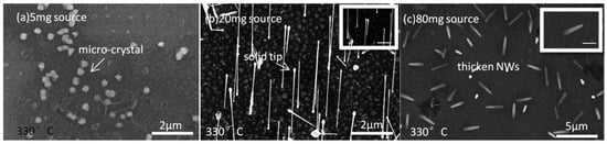 In Figure 1, the InSb NWs shown were synthesized at 330 °C for 60 min using 5 mg (Figure 1a), 20 mg (Figure 1b), and 80 mg (Figure 1c) of powder source, respectively. Using a 5 mg powder source as the precursor (Figure 1a), only large bulk crystals are observed on the growth substrate. This is probably because NWs cannot be grown under low-PVC conditions at a low temperature (330 °C in this case), which is lower than the critical temperature allowing NW growth [34,45]. Similar conditions will lead to the growth of 2D layers or microcrystals on the substrate [21]. By increasing PVC by adding more powder, InSb NWs were successfully synthesized on the substrates, and the typical NW morphology is shown in Figure 1b,c. Using 20 mg of source material at 330 °C (Figure 1b), NWs indicate a larger tip diameter of about 100 nm and a smaller bottom diameter of about 50 nm, with a uniform growth direction, and the NW length is about 3.2 µm. A higher-magnification image inset in Figure 1b shows that the NWs are tapered gradually toward the base, and solid-shaped catalytic particles (CPs) are located on top of the NWs. This reverse tapering in NW morphology can be explained by Ostwald ripening (coarsening) of the catalyst particles during the annealing period, resulting in the formation of larger Au–In alloy particles [58,64].