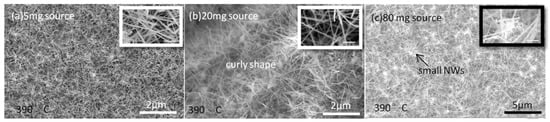 It is well known that growth temperature and precursor pressure play important roles in controlling the growth of NWs, particularly their morphology [20,63]. Since a tube-in-tube CVD setup with a powder source as the precursor is widely used, it is crucial to evaluate the effect of powder-source amount on NW growth. InSb NW morphology is found to be influenced by the growth temperature in the range of 330–450 °C and by the amount of powder source (5 mg, 20 mg, and 80 mg), corresponding to the precursor vapor concentration (PVC). A series of SEM images of InSb NWs synthesized under different processing conditions are presented in Figure 1, Figure 2 and Figure 3.