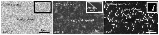 InSb NWs grown at 450 °C are shown in Figure 3. Conical-shaped InSb NWs are observed in Figure 3a under low-PVC conditions. No Au–In alloy particle tips are observed atop the NWs. Instead, the presence of a sharp tip and the high slope of the NW body suggest that Au atoms migrate out of the catalytic Au–In particles, resulting in the shrinking of the CPs, which finally disappear [42]. NWs with straight but tapered morphology are shown in Figure 3b. From the inset SEM image, the NW diameter is about 40 nm at the tip and 60 nm at the base. A shrinking, round tip is clearly observed at the top, which suggests a vapor–liquid–solid (VLS) mechanism. However, the catalyst size is smaller than 60 nm, likely due to the migration of Au atoms during growth. In Figure 3c, NWs grown with the largest source amount (80 mg) are tapered gradually toward the tip with a zigzag morphology along the NW sidewalls. The diameter at the base is 2–3 times larger than that of the tip. The zigzag shape of NWs suggests direct deposition onto the NW sidewalls from the vapor source or from adatoms on the substrate. Such zigzag sidewalls are usually observed at high temperatures and high-PVC conditions [63,67].