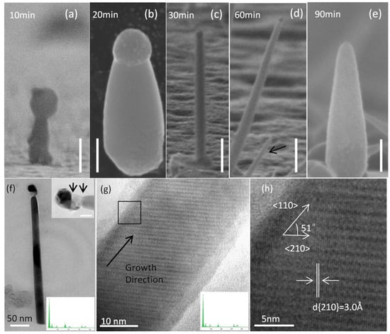 It has been observed that Au catalyst atoms may migrate during the growth process, based on the experiments described above. To clarify the effect of Au catalyst migration on NW morphology and to better understand the entire NW growth process, a series of samples was synthesized for growth durations of 10, 20, 30, 60, and 90 min at a 450 °C growth temperature (to enable a high Au catalyst migration rate) using a 20 mg powder source. Figure 4a–e show SEM images for these five samples, respectively. NWs grown for 10 min (Figure 4a) are highly tapered with a wide base, and approximately 50 nm diameter Au–In CPs are observed at the tips. The NW body displays a rough morphology, and not all catalyst particles have NWs grown underneath. Figure 4b shows an NW grown for 20 min with much smoother sidewalls. Round-shaped CPs are clearly seen with a diameter of approximately 80 nm, slightly larger than the original catalyst particles, which can be attributed to alloying with indium. Straight InSb NWs with a uniform diameter are observed in the sample grown for 30 min (Figure 4c). The CPs are found on top of the NWs and are approximately 60 nm in diameter, and the NW length is nearly 2 µm. We believe that Au atoms started migrating, resulting in a smaller alloy particle compared to the 20 min growth case. Au migration should enhance NW tapering because it weakens the collection ability of the Au–In CPs according to the traditional VLS mechanism. However, our observations contradict this presumption, indicating that other processes contributing to NW growth should also be taken into account. NW morphology indicates tapering again for the sample grown for 60 min (Figure 4d). Shrinking of the Au–In CPs is evident, and the NW length increases to 3.3 µm. We also observe shorter NWs beneath these NWs, likely arising from migrated Au-catalyst-assisted growth. NWs show an increased diameter after 90 min, as shown in Figure 4e. As mentioned previously, a 2D layer forms across the substrate at a constant growth rate alongside NW growth. The 2D layer maintains a constant growth rate, while the NW axial growth rate decreases because of catalyst migration and finally stops after the CPs disappear. Furthermore, some NWs become buried under the 2D layer and cannot be distinguished in the SEM images, resulting in the shorter NWs observed at 90 min. Although ⟨111⟩ growth is typically dominant for Au-assisted III–V nanowires, our InSb nanowires exhibited a ⟨110⟩ growth axis. This arises from the specific interplay of precursor concentration, growth temperature, and Au–In–Sb droplet energetics, which stabilize {110} facets. Similar reports of ⟨110⟩ InSb NWs under epitaxial CVD conditions suggest that this orientation, while less common, can be reproducibly obtained under optimized growth kinetics. TEM imaging of a typical tapered NW is shown in Figure 4f–h. The NW was grown at 450 °C using a 20 mg source and a 60 min growth time, resulting in a tip diameter of 20 nm and a base diameter of 40 nm. High-resolution TEM (HRTEM) was performed to characterize the NW growth direction. A d spacing of 3.0 Å was measured corresponding to the {210} family of planes. An angular spacing of 51° was measured between the growth direction and ⟨210⟩, confirming a ⟨110⟩-type growth direction for the InSb NWs. Energy-dispersive X-ray spectroscopy (EDAX) showed that the NW body is composed of indium and antimony, while the CP at the tip of the NW also comprises Au. No Au was observed along the NW body, which might be because diffused Au served as a catalyst for nucleating smaller NWs, as shown in Figure 4d.
