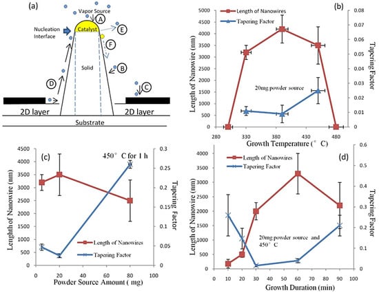 The morphology of the resulting NWs can be interpreted by the kinetics of the growth species involved and by diffusion of adatoms from the substrate and the Au catalyst [24,41,42,43]. NW morphology is mainly affected by different axial and radial growth under different processing conditions. Theoretical and experimental work has reported that a number of growth parameters impact the axial and radial growth of NWs, affecting the final morphology [24,25,26,27,28,29,32,44,45]. Fundamental experiments representing different growth conditions are a must for identifying the growth mechanism and achieving controlled growth of NWs for practical applications.