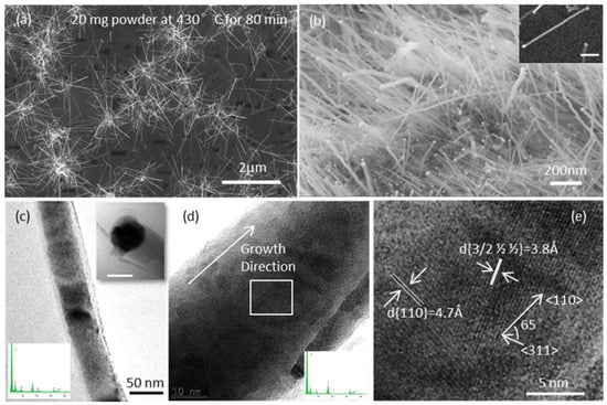 Figure 6a,b show typical top-view and corresponding tilted-view (45°) SEM images of InSb NWs with a uniform diameter along the NW body. These NWs were grown at 430 °C for 80 min with 60 nm Au catalysts using a 20 mg powder source. The NW diameters are in the range of 20–100 nm, and the length is approximately 3 µm. TEM images in Figure 6c–e reveal the detailed morphology and crystal structure of InSb NWs. Figure 6c shows that an InSb NW has a nearly uniform 50 nm diameter. A CP tip is clearly seen, as shown in the inset. HRTEM results (Figure 6c,d) show that the growth direction of the NW is along ⟨110⟩. The amorphous thin film around the NW is possibly due to post-growth processing. A d spacing of 4.7 Å corresponding to the {110} planes and a d spacing of 3.8 Å indicating the {311} planes are characterized in Figure 6e. A 65° angle between these two planes is observed, which is one of the interplanar angles between {311} and {110}. This confirms the ⟨110⟩ growth direction of InSb NWs. EDAX spectra taken from the NW body reveal no Au along the body, only at the tips. Figure S7 shows an XRD spectrum for InSb grown on an InAs substrate, consistent with ⟨110⟩-oriented InSb nanowires. In the zinc blende structure of InSb, the diffraction vector for the (220) family is parallel to ⟨110⟩; the disproportionately strong InSb (220) intensity relative to powder ratios—together with reduced (111)/(311)—indicates a ⟨110⟩ fiber texture, i.e., the nanowires are preferentially aligned along the ⟨110⟩ axis. This matches our TEM imaging, which also points to ⟨110⟩ axial growth.