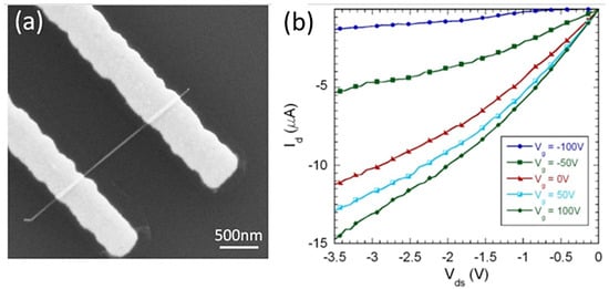 Electrical measurements: I–V and transfer curves were recorded at room temperature using an Agilent 4155C (Agilent Technologies, Santa Clara, CA, USA). Devices with ~50 nm diameter nanowires exhibited linear I_D–V_DS and n-type transfer characteristics; a representative average device resistance was ~250 kΩ.