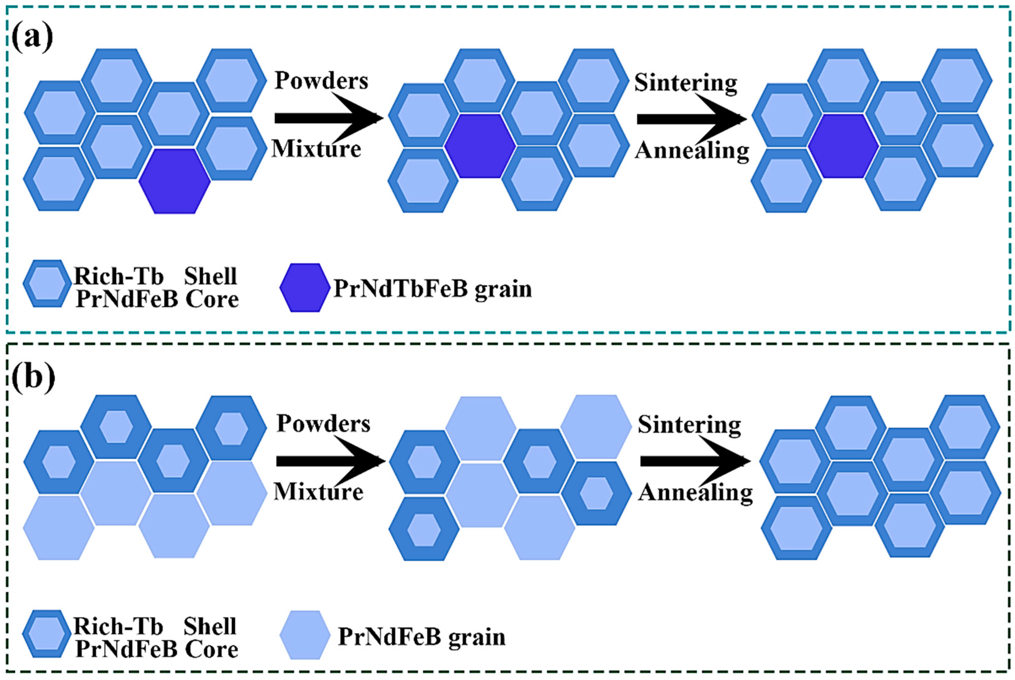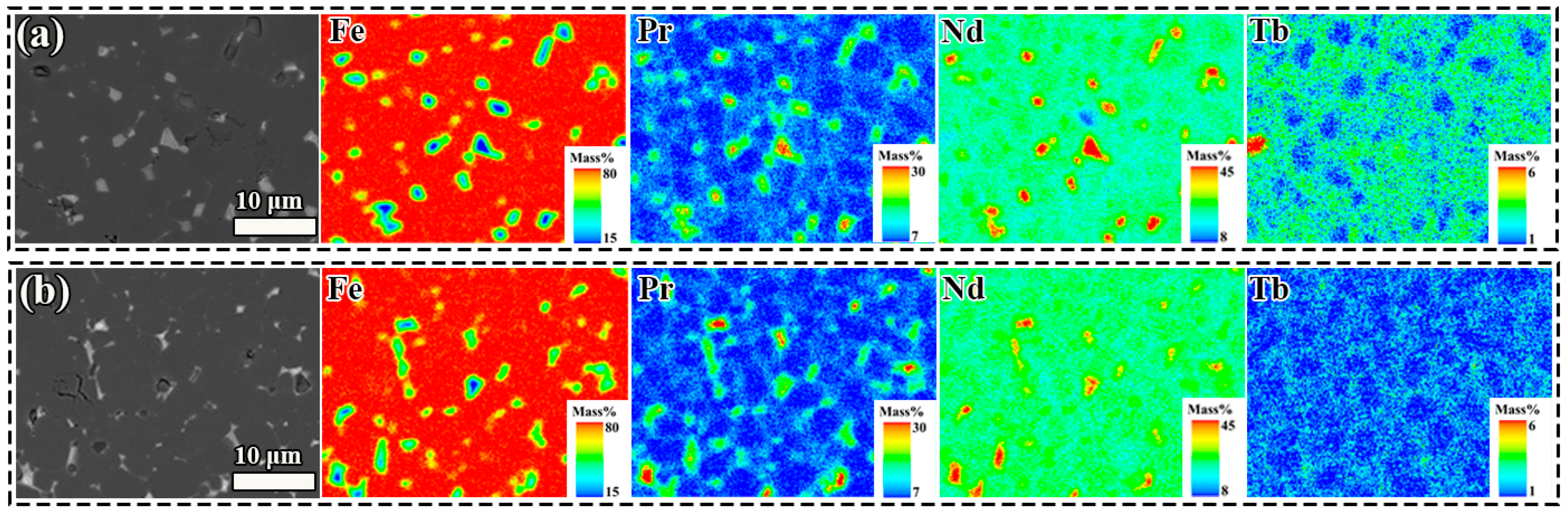 - Chang, R.; Bai, G.; Li, Y.; Yan, Z.; Qin, X.; Guo, J.; Wang, F.; Xu, X. Synergistic regulation and optimization of microstructure, coercivity, and thermal stability in sintered NdFeB magnets through grain boundary diffusion of Dy and Al elements. J. Mater. Res. Technol. 2025, 34, 2183–2192. [Google Scholar] [CrossRef]