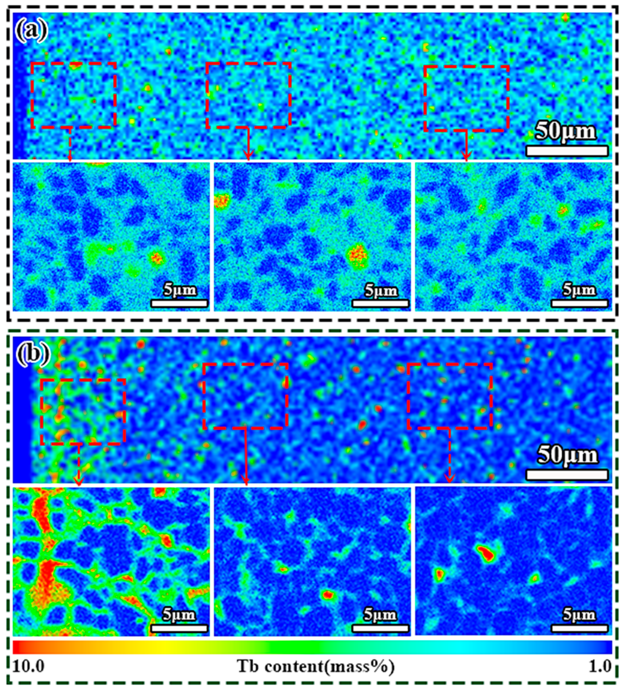 - Zhao, L.; He, J.; Li, W.; Liu, X.; Zhang, J.; Wen, L.; Zhang, Z.-H.; Hu, J.; Zhang, J.; Liao, X.; et al. Understanding the Role of Element Grain Boundary Diffusion Mechanism in Nd–Fe–B Magnets. Adv. Funct. Mater. 2022, 32, 2109529. [Google Scholar] [CrossRef]