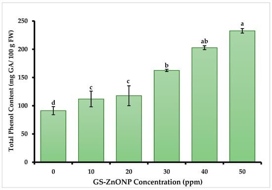 The results indicate that foliar application of GS-ZnONPs significantly affected the content of total phenols and flavonoids in the chili fruit. The highest TPC (Figure 1) was measured in the 30 and 40 ppm treatments, with contents of 202.7 ± 3.4 and 232.7 ± 3.9 mg GA 100 g FW−1, respectively, 121% and 154% higher than the control treatment.