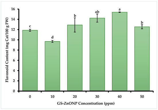 Similar effects were observed in flavonoid concentration (Figure 2). The highest concentration of total flavonoids was found in plants treated with 40 ppm of GS-ZnONPs, with a concentration of 15.39 ± 0.80 mg Cat 100 g FW−1.