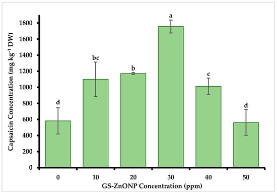 Figure 4. Capsaicin concentration in Capsicum annuum fruit treated with different GS-ZnONP concentrations (0 ppm indicates untreated control). Values are the average of 3 measurements ± SD. Values with different letters indicate a significant difference, according to Tukey’s test (p ≤ 0.05).