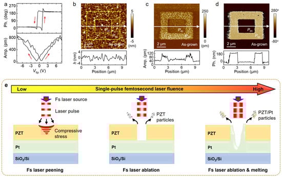 Characterizations of ferroelectric PZT thin films grown on a Pt/SiO2/Si substrate. (a) Switching hysteresis of (top) phase and (bottom) amplitude responses taken on as-grown PZT thin film (~50 nm). The red arrows illustrate the switching direction; (b) AFM topography, PFM (c) amplitude, and (d) phase images of square domains written on a PZT thin film. The lower panels in (b–d) show the cross-sectional signal profiles along the white solid lines. The yellow dashed lines in (b) mark the edges of PZT domain pattern. The dark and bright regions in (d) represent Pdn and Pup states, respectively; (e) Schematic view showing different interactions between PZT layers and fs laser pulse by varying the laser fluence: (left panel) laser peening effect, (middle panel) laser ablation effect, and (right panel) laser ablation and melting effects.