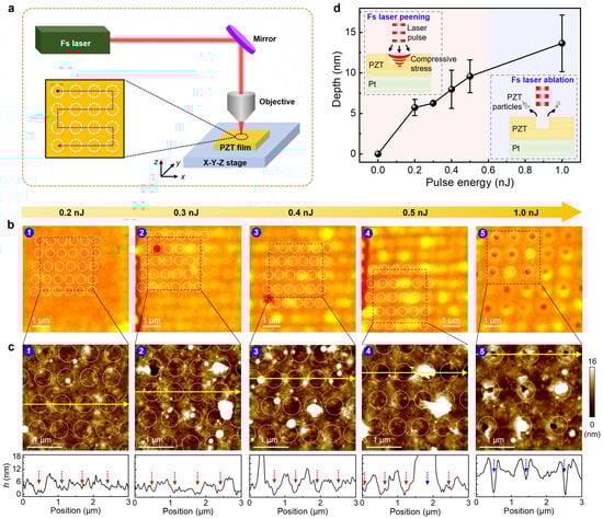 Fabrication of nano-concave arrays in PZT thin films by fs laser peening. (a) Schematic illustration of microstructure engineering in PZT thin films by single fs laser pulse scan (scanning pitch: ~0.96 μm); (b) Optical images and (c) AFM topographies of nanostructures generated on PZT thin films by single fs laser pulse irradiation at different laser fluences (ranging from 0.2 nJ to 1 nJ). The white dashed circles in (b,c) represent fs laser pulse irradiation sites. The lower panels in (c) show the cross-sectional height profiles along the yellow solid lines. The red dotted arrows point to the peening action area (0.2–0.5 nJ), while the blue arrows point to the ablation action area (0.5–1 nJ); (d) Dependence of nano-concave (or nano-volcano) depth, with error bars, on fs laser pulse fluence. The insets show schematics for nano-concave and nano-volcano formation mechanisms via a single fs laser pulse.