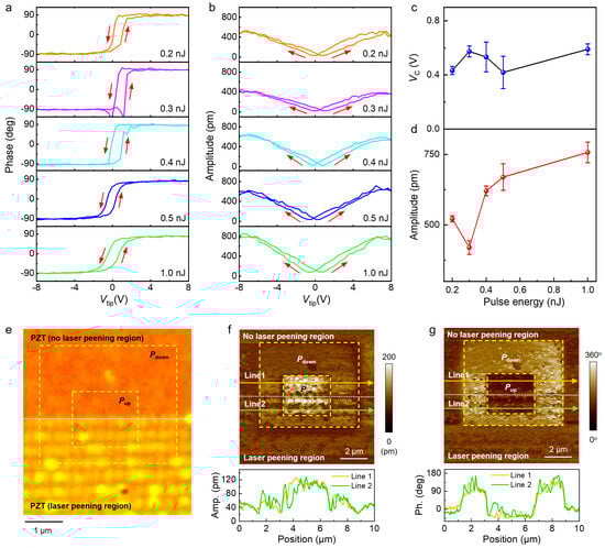 Next, we explore the effect of single-pulse fs laser irradiation on the ferroelectric and piezoelectric responses in PZT ultrathin films using the PFM technique. PFM has been proven to be a reliable approach that can be used to quantitatively characterize the ferroelectric and piezoelectric properties of various ferroelectric materials in local areas [37,38,39]. Figure 3a and Figure S3 compare the switching hysteresis of PFM phase response taken on PZT nanostructure arrays fabricated with fs laser peening at different laser fluences, where similar phase hysteresis curves are detected. Figure 3c quantitatively analyzes the dependence of coercive voltage (VC) extracted from Figure 3a and Figure S3 on fs laser fluence. It is clear that the average VC remains stable (~0.5 ± 0.1 V) across a wide laser fluence range of 0.2 nJ to 1.0 nJ. This indicates that the ferroelectric polarization switching energy barrier does not alter. Thus, we can conclude that the fs laser-peening process exerts minimal influence on the ferroelectric properties of PZT ultrathin films. Figure 3b compares the switching hysteresis of PFM amplitude response taken from the same sample in Figure 3a at different laser fluences. The dependence of maximum amplitude extracted from Figure 3b and Figure S3 on fs laser fluence is shown in Figure 3d. It is found that, with increasing the laser fluence, the amplitude signal continuously increases, revealing significant enhancement of piezoelectric performance in PZT thin films.