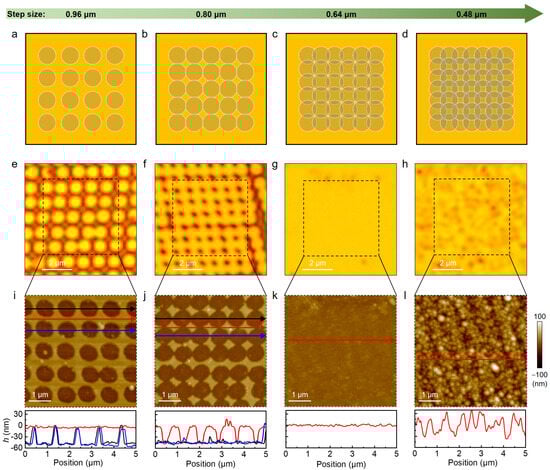 Fabrication of nano-cave arrays in PZT thin films by fs laser ablation. Schematics of nano-cave array formation in PZT thin film by fs laser scan at different step sizes: (a) 0.96 μm, (b) 0.80 μm, (c) 0.64 μm, and (d) 0.48 μm; Optical images of nano-cave array fabricated on PZT thin film with a fs laser pulse fluence of 2 nJ at different step sizes: (e) 0.96 μm, (f) 0.80 μm, (g) 0.64 μm, and (h) 0.48 μm. The bright and dark colors in (e,f) represent laser processed and unprocessed regions, respectively; AFM topographies of nano-cave array fabricated on PZT thin film (black boxes in (e–h)) with a fs laser pulse fluence of 2 nJ at different step sizes: (i) 0.96 μm, (j) 0.80 μm, (k) 0.64 μm, and (l) 0.48 μm. The lower panels in (i–l) show the cross-sectional height profiles along the solid lines. The black (blue) and red curves represent the height profiles along the center and edge positions of nano-cave arrays, respectively.