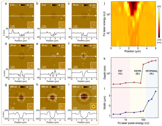 Nanostructure evolution in PZT/Pt/SiO2 multilayers as a product of laser pulse fluence under single-point fs laser irradiation. AFM topographies of nano-cave structures fabricated on PZT/Pt/SiO2 multilayers by single fs laser pulse with a laser fluence of (a) 2 nJ, (b) 5 nJ, (c) 10 nJ, (d) 30 nJ, (e) 70 nJ, (f) 100 nJ, (g) 200 nJ, (h) 300 nJ, and (i) 500 nJ. Insets: corresponding optical images; (j) 3D height profiles of nano-cave structures fabricated at different fs laser pulse fluences, extracted from the white lines in (a–i); (k) The dependence of nano-cave structure depth (red dots) on fs laser pulse energy; (l) The dependence of nano-cave structure width (blue dots) on fs laser pulse energy.