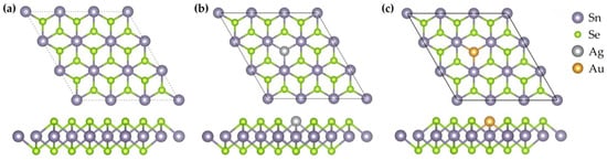 Top and side views of the optimized SnSe2 (3 × 3 × 1) supercells: (a) pristine; (b) Ag-doped with Ag substituting a Se atom; (c) Au-doped with Au substituting a Se atom.