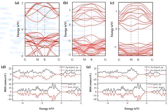 Electronic properties of pristine and noble metal-doped SnSe2 monolayers: (a) Band structure of pristine SnSe2; (b) Band structure of Ag-doped SnSe2; (c) Band structure of Au-doped SnSe2; (d) Total DOS (TDOS) of pristine and Ag-doped SnSe2; (e) TDOS of pristine and Au-doped SnSe2.