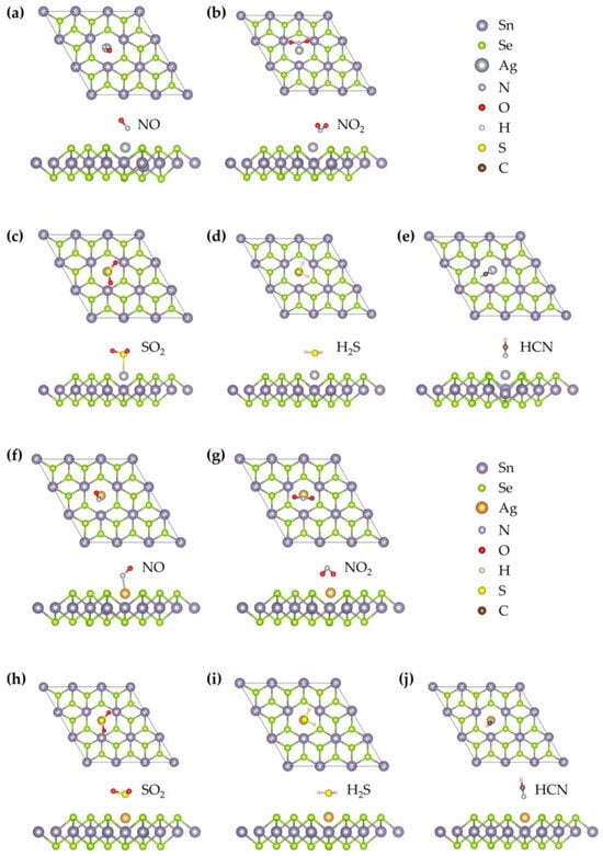 Optimized top and side views of five gas molecules adsorbed on (a–e) Ag-doped and (f–j) Au-doped SnSe2 monolayers: (a,f) NO; (b,g) NO2; (c,h) SO2; (d,i) H2S; (e,j) HCN.