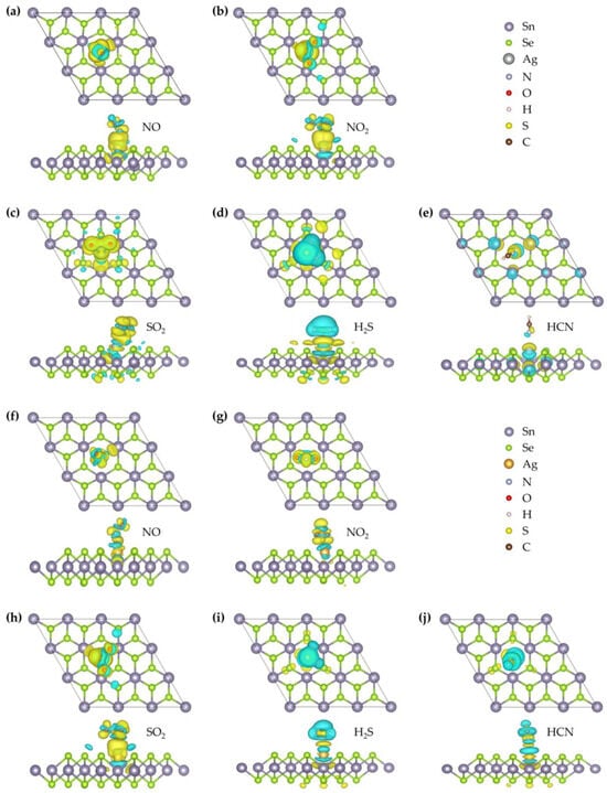 Top and side views of CDD plots for five gas molecules adsorbed on (a–e) Ag-doped and (f–j) Au-doped SnSe2 monolayers: (a,f) NO; (b,g) NO2; (c,h) SO2; (d,i) H2S; (e,j) HCN.