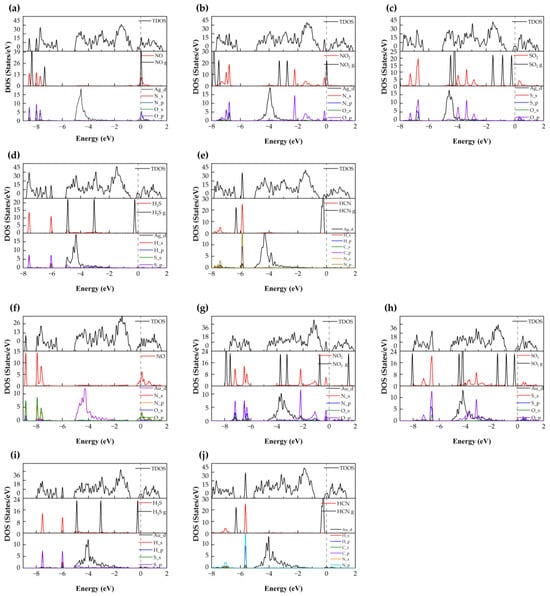 TDOS and PDOS plots of five gas molecules adsorbed on (a–e) Ag-doped and (f–j) Au-doped SnSe2 monolayers: (a,f) NO; (b,g) NO2; (c,h) SO2; (d,i) H2S; (e,j) HCN.