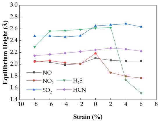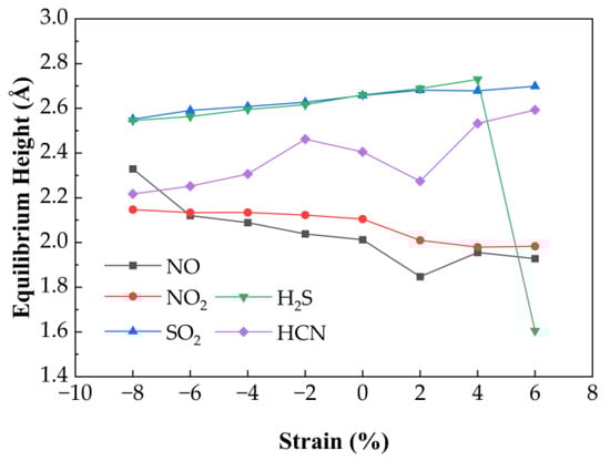 Variation in gas equilibrium heights for five adsorption systems on Au-doped SnSe2 monolayers under biaxial strain ranging from −8% to 6%.