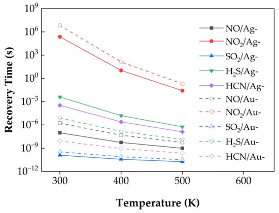 At room temperature (T = 300 K), ≈ 2.585 × 10−2 eV. As seen from the equation, recovery time increases exponentially with adsorption energy. Figure 10 presents the calculated recovery times at 300 K, 400 K, and 500 K without applying external strain. At 300 K, the order of recovery time from shortest to longest is: SO2/Ag–SnSe2, SO2/Au–SnSe2, HCN/Au–SnSe2, NO/Ag–SnSe2, NO/Au–SnSe2, H2S/Au–SnSe2, HCN/Ag–SnSe2, H2S/Ag–SnSe2, NO2/Ag–SnSe2, and NO2/Au–SnSe2.